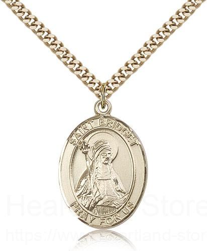 This St. Bridget of Sweden Pendant is made of gold filled and is approximately the size of a quarter. The jewelry pendant is paired with a 24 inch gold filled heavy curb chain as pictured. All medals are gift boxed in a beautiful blue velvet hinged jewelry gift box.