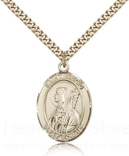 This St. Brigid of Ireland Pendant is made of gold filled and is approximately the size of a quarter. The jewelry pendant is paired with a 24 inch gold filled heavy curb chain as pictured. All medals are gift boxed in a beautiful blue velvet hinged jewelry gift box.