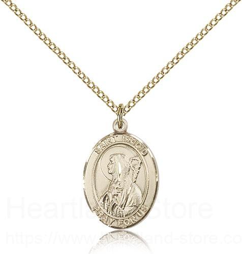 This St. Brigid of Ireland Pendant is made of gold filled and is approximately the size of a nickel. The jewelry pendant is paired with an 18 inch gold filled light curb chain as pictured. All medals are gift boxed in a beautiful blue velvet hinged jewelry gift box.