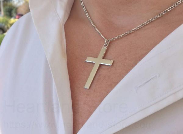 This is a beautifully understated cross made of genuine .925 sterling silver and hand made in the USA. The front features a brushed matte finish with all the edges etched so that it catches the light and glistens. You'll absolutely get great compliments when wearing this cross.