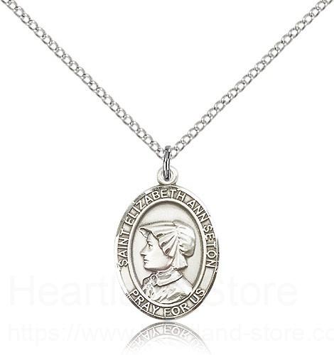 This St. Elizabeth Ann Seton Pendant is made of sterling silver and is approximately the size of a nickel. The jewelry pendant is paired with an 18 inch sterling silver light curb chain as pictured. All medals are gift boxed in a beautiful blue velvet hinged jewelry gift box.