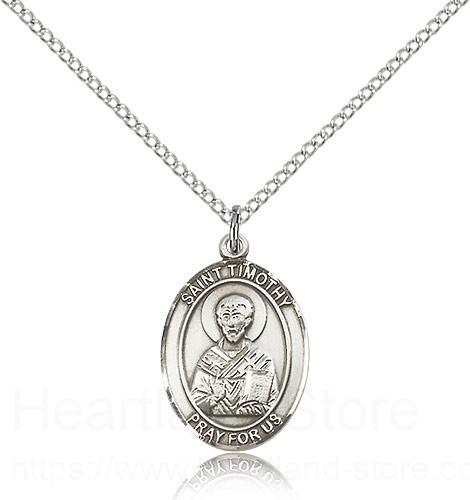 This St. Timothy Pendant is made of sterling silver and is approximately the size of a nickel. The jewelry pendant is paired with an 18 inch sterling silver light curb chain as pictured. All medals are gift boxed in a beautiful blue velvet hinged jewelry gift box.