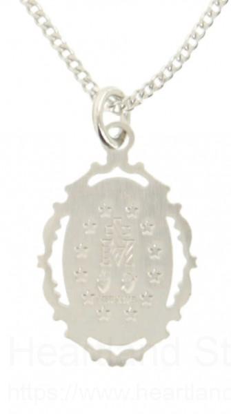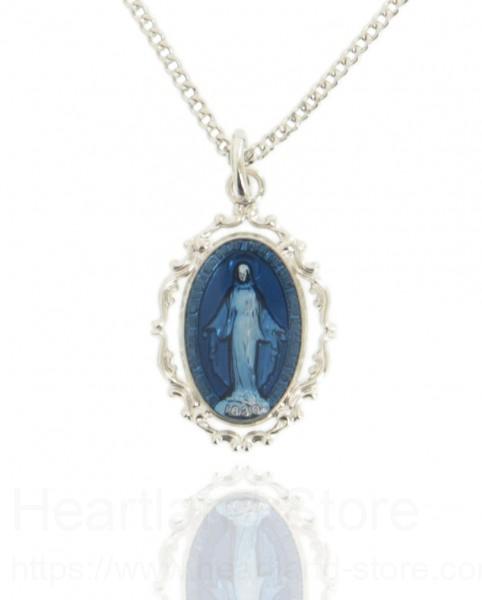 About this Women's Sterling Silver Oval Dark Blue Enamel Miraculous Medal with Baroque Border + 18" 2.1mm Rhodium Plate Chain + Clasp