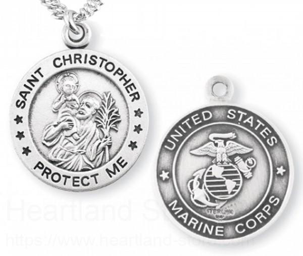 This is a sterling silver St. Christopher Marine medal that measures approximately 7/8" diameter and comes with a 24" rhodium plated stainless steel chain. On the other side of the medal is an image of St. Christopher and the words, "St. Christopher Protect Me." Comes in a lovely gift box.