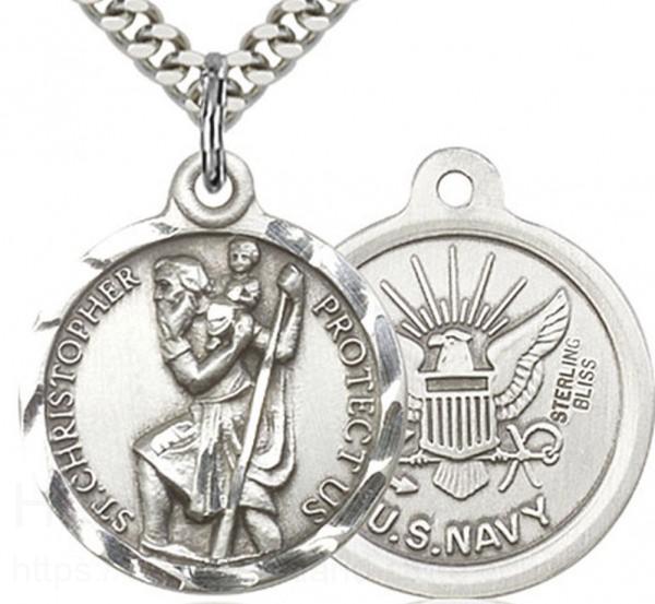 About this St. Christopher Navy Medal, Sterling Silver + 24" 2.2mm Sterling Silver Chain + Clasp