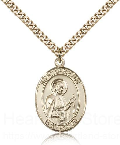 This St. Camillus of Lellis Pendant is made of gold filled and is approximately the size of a quarter. The jewelry pendant is paired with a 24 inch gold filled heavy curb chain as pictured. All medals are gift boxed in a beautiful blue velvet hinged jewelry gift box.