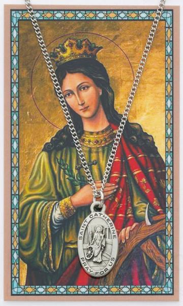 This lovely St. Catherine prayer card and pendant combination is sure to please. This medallion displays a image of St. Catherine standing next to a wheel while holding a fern. The St. Catherine pendant has the following features;