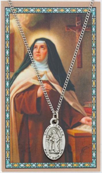 The St. Teresa prayer card measures 4.5" x 2.5" and is laminated for durability. On the front of the card is a lovely full color image of St. Teresa and displays her with a hovering dove, holding a feather pen and book. There is also a lighted aura surrounding St. Teresa as an example of her devotion to mental prayer and mysticism.