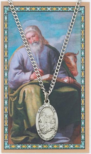 The St. Luke prayer card is laminated and measures 4.5" x 2.5". The prayer card has a full color image of St. Luke holding a book and feather pen. At the bottom of the card are the words St. Luke. The back of the card has a prayer to St. Luke.