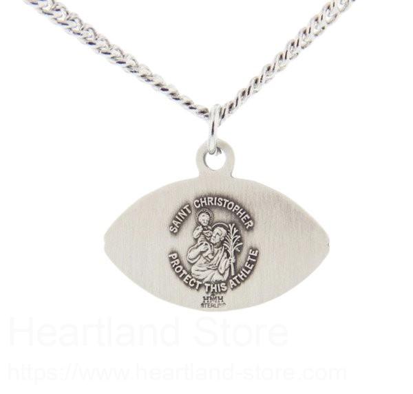 Love football? You'll love this pendant too! This medal is designed in a football shape on the front and on the back is a raised image of Saint Christopher. The back of the pendant reads "Saint Christopher Protect This Athlete".