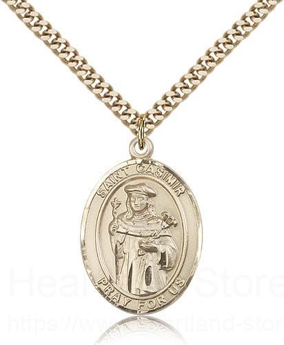 This St. Casimir of Poland Pendant is made of gold filled and is approximately the size of a quarter. The jewelry pendant is paired with a 24 inch gold filled heavy curb chain as pictured. All medals are gift boxed in a beautiful blue velvet hinged jewelry gift box.