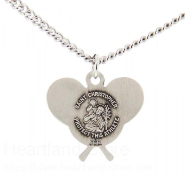 A really unique and great looking tennis necklace is perfect to wear on and off the court. The medal is designed with tennis rackets and a ball on the front. On the back is a raised image of Saint Christopher. The back of the pendant reads "Saint Christopher Protect This Athlete".