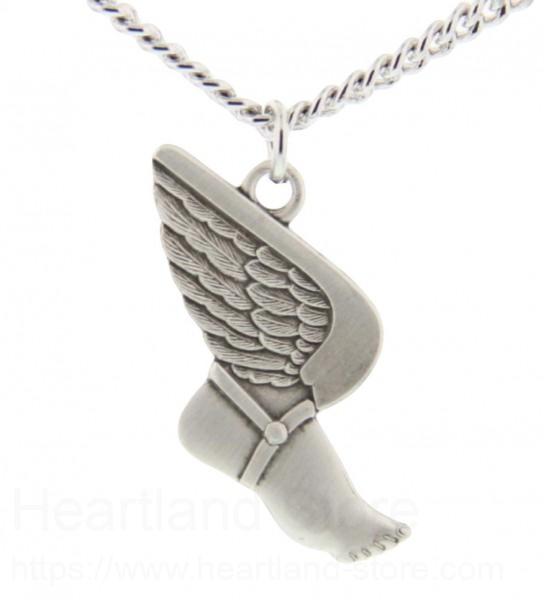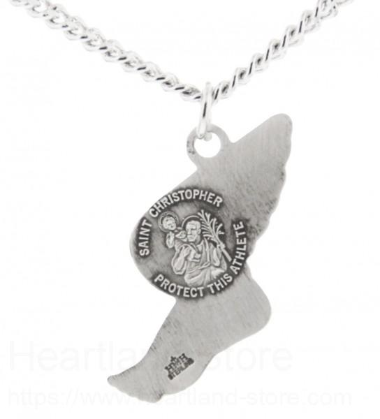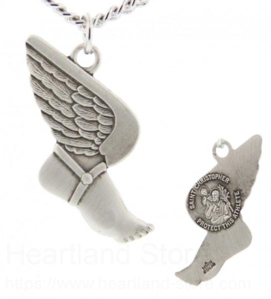Timing and speed are so important in the world of track and field. Wearing this winged foot is hugely symbolic as it references Hermes, who wore the winged sandals that allowed him to travel on road and water at the greatest speed. On the back is a raised image of Saint Christopher. The back of the pendant reads "Saint Christopher Protect This Athlete".