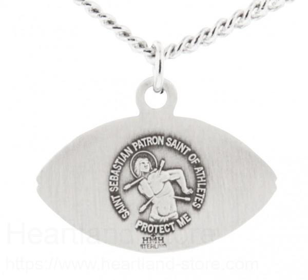 How great is this football medal? It is designed in the shape of a football and a perfect necklace to wear on game day, practice and off the field too. On the back is a raised image of Saint Sebastian. The back of the pendant reads "Saint Sebastian Protect This Athlete".