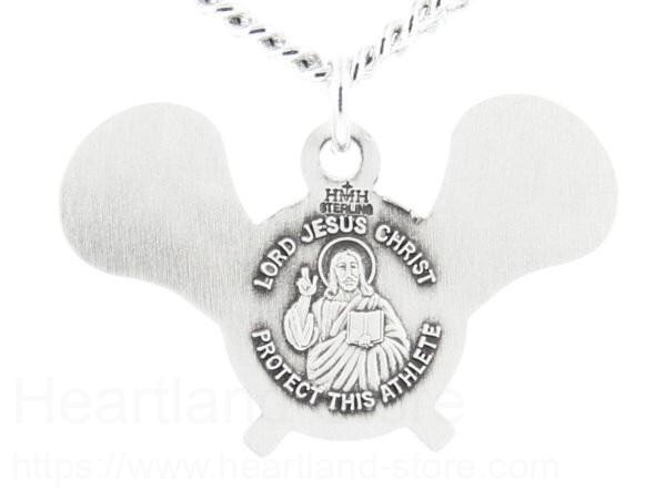 Grow in your faith and ask the Lord for His help and protection on and off the lacrosse field. The pendant is in the shape of lacrosse sticks and ball. On the back is a raised image of Jesus. The back of the pendant reads "LORD JESUS CHRIST PROTECT THIS ATHLETE".