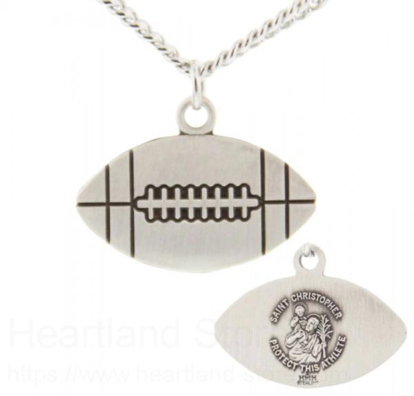 Love football? You'll love this pendant too! This medal is designed in a football shape on the front and on the back is a raised image of Saint Christopher. The back of the pendant reads "Saint Christopher Protect This Athlete".
