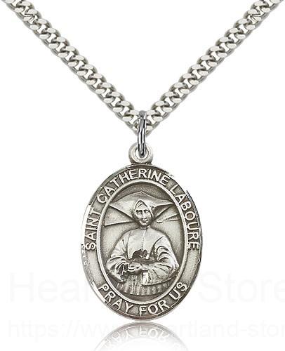 This St. Catherine Laboure Pendant is made of sterling silver and is approximately the size of a quarter. The jewelry pendant is paired with a 24 inch stainless steel heavy curb chain as pictured. All medals are gift boxed in a beautiful blue velvet hinged jewelry gift box.