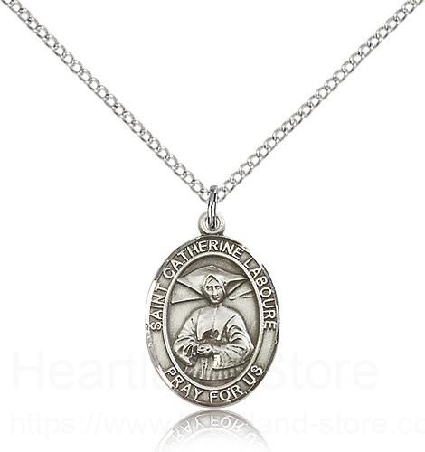 This St. Catherine Laboure Pendant is made of sterling silver and is approximately the size of a nickel. The jewelry pendant is paired with an 18 inch sterling silver light curb chain as pictured. All medals are gift boxed in a beautiful blue velvet hinged jewelry gift box.