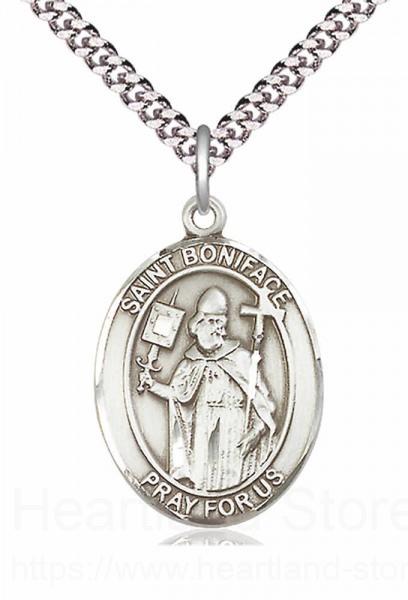 About this Men's Pewter Oval St. Boniface Medal + 20" Rhodium Plate Chain + Clasp