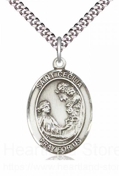 An oval shaped pendant with an image ofSt. Cecilia in the center. There is a selection of chains to choose from.