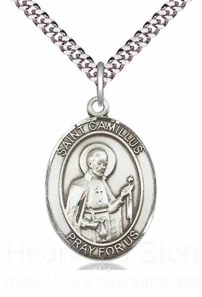An oval shaped pendant with an image ofSt. Camillus in the center. There is a selection of chains to choose from.