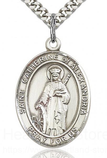 About this St. Catherine of Alexandria Medal, Sterling Silver, Large + 24" 2.4mm Rhodium Plate Chain + Clasp
