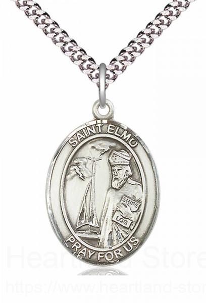 An oval shaped pendant with an image ofSt. Elmo in the center. There is a selection of chains to choose from.