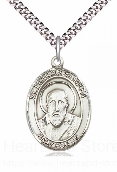 An oval shaped pendant with an image ofSt. Francis De Sales in the center. There is a selection of chains to choose from.