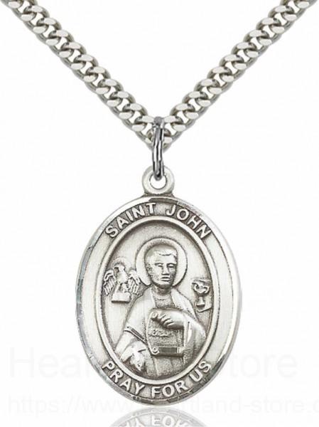An oval shaped pendant with an image of St. John the Apostle in the center. There is a selection of chains to choose from.