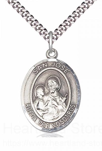 An oval shaped pendant with an image of St. Joseph in the center. There is a selection of chains to choose from.