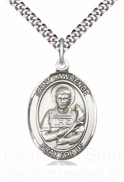 An oval shaped pendant with an image of St. Lawrence in the center. There is a selection of chains to choose from.