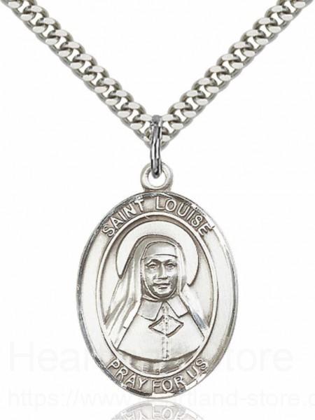An oval shaped pendant with an image of St. Louise De Marillac in the center. There is a selection of chains to choose from.