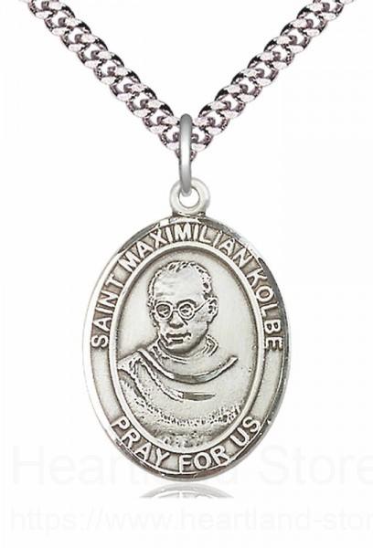 An oval shaped pendant with an image of St. Maximilian Kolbe in the center. There is a selection of chains to choose from.