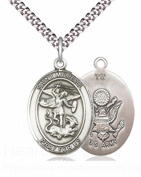 About this Men's Pewter Oval St. Michael Army Medal + 24" 2.4mm Rhodium Plate Endless Chain