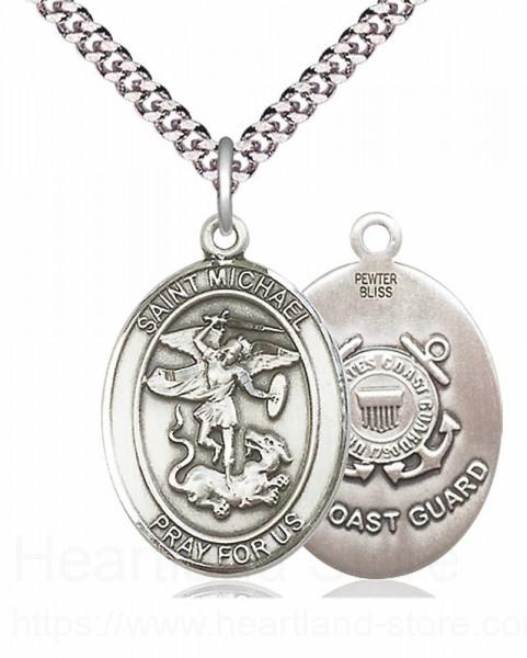 About this Men's Pewter Oval St. Michael Coast Guard Medal + 24" 2.4mm Rhodium Plate Chain + Clasp
