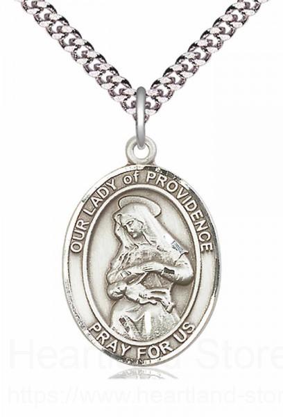 About this Men's Pewter Oval Our Lady of Providence Medal + 24" 2.4mm Rhodium Plate Chain + Clasp