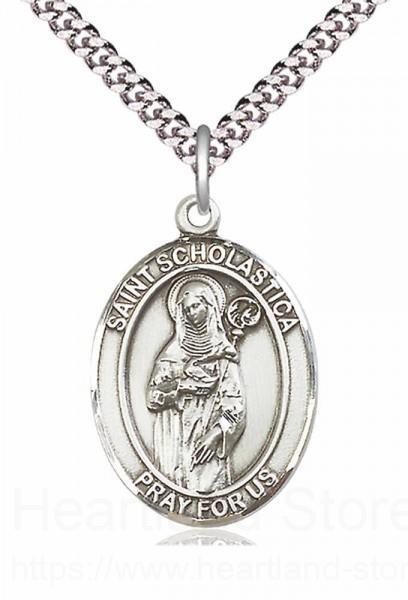 About this Men's Pewter Oval St. Scholastica Medal + 24" 2.4mm Rhodium Plate Endless Chain