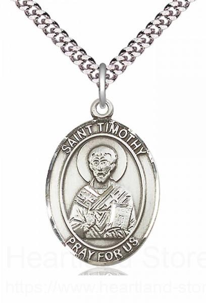 About this Men's Pewter Oval St. Timothy Medal + 24" 2.4mm Rhodium Plate Chain + Clasp