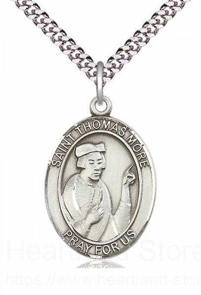 An oval shaped pendant with an image of St. Thomas More in the center. There is a selection of chains to choose from.