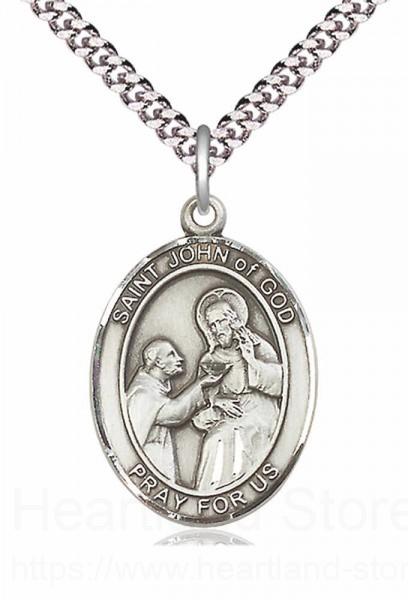 About this Men's Pewter Oval St. John of God Medal + 24" 2.4mm Rhodium Plate Endless Chain