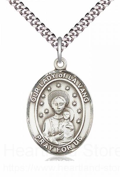 About this Men's Pewter Oval Our Lady of La Vang Medal + 24" 2.4mm Rhodium Plate Chain + Clasp
