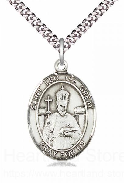 About this Men's Pewter Oval St. Leo the Great Medal + 24" 2.4mm Rhodium Plate Chain + Clasp