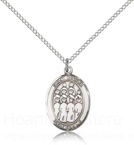 This St. Cecilia Choir Pendant is made of sterling silver and is approximately the size of a nickel. The jewelry pendant is paired with an 18 inch sterling silver light curb chain as pictured. All medals are gift boxed in a beautiful blue velvet hinged jewelry gift box.