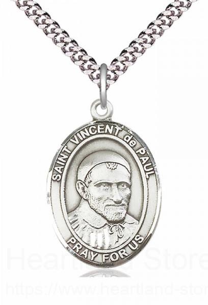 An oval shaped pendant with an image of St. Vincent de Paul in the center. There is a selection of chains to choose from.