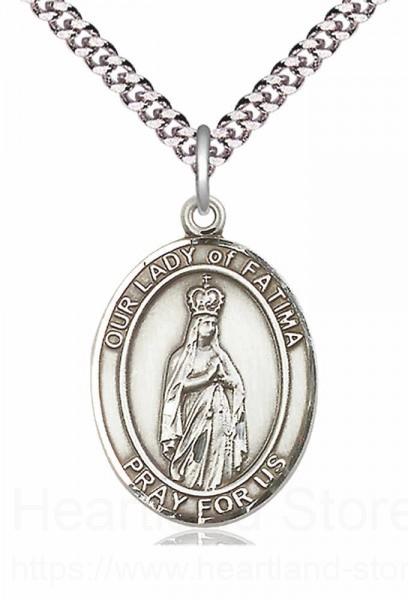 About this Men's Pewter Oval Our Lady of Fatima Medal + 24" 2.4mm Rhodium Plate Chain + Clasp