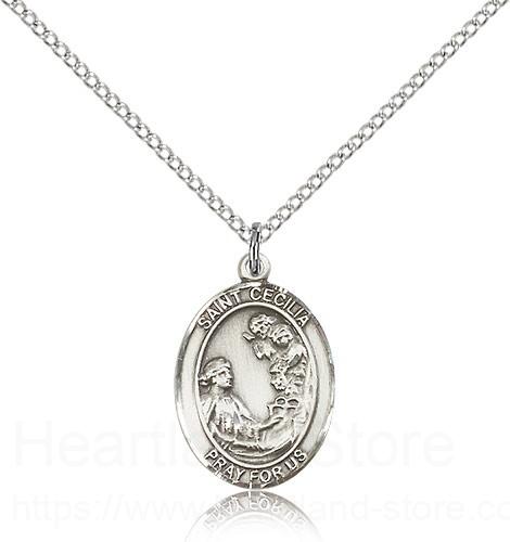 This St. Cecilia Pendant is made of sterling silver and is approximately the size of a nickel. The jewelry pendant is paired with an 18 inch sterling silver light curb chain as pictured. All medals are gift boxed in a beautiful blue velvet hinged jewelry gift box.