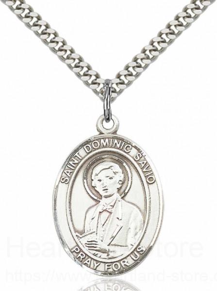 An oval shaped pendant with an image of St. Dominic Savio in the center. There is a selection of chains to choose from.