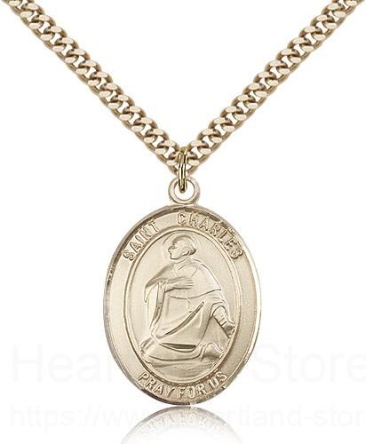 St. Charles Borromeo Medal This St. Charles Borromeo Pendant is made of gold filled and is approximately the size of a quarter. The jewelry pendant is paired with a 24 inch gold filled heavy curb chain as pictured. All medals are gift boxed in a beautiful blue velvet hinged jewelry gift box.