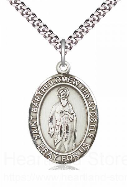 An oval shaped pendant with an image of St. Bartholomew the Apostle in the center. There is a selection of chains to choose from.