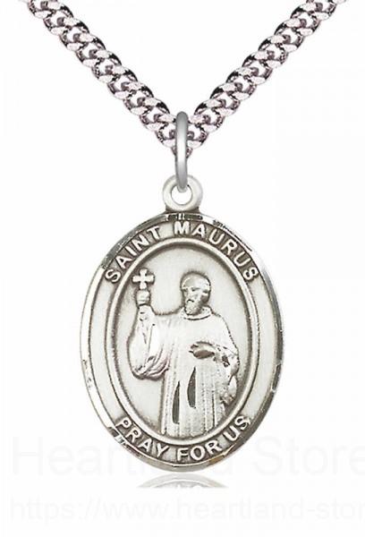 About this Men's Pewter Oval St. Maurus Medal + 24" 2.4mm Rhodium Plate Endless Chain